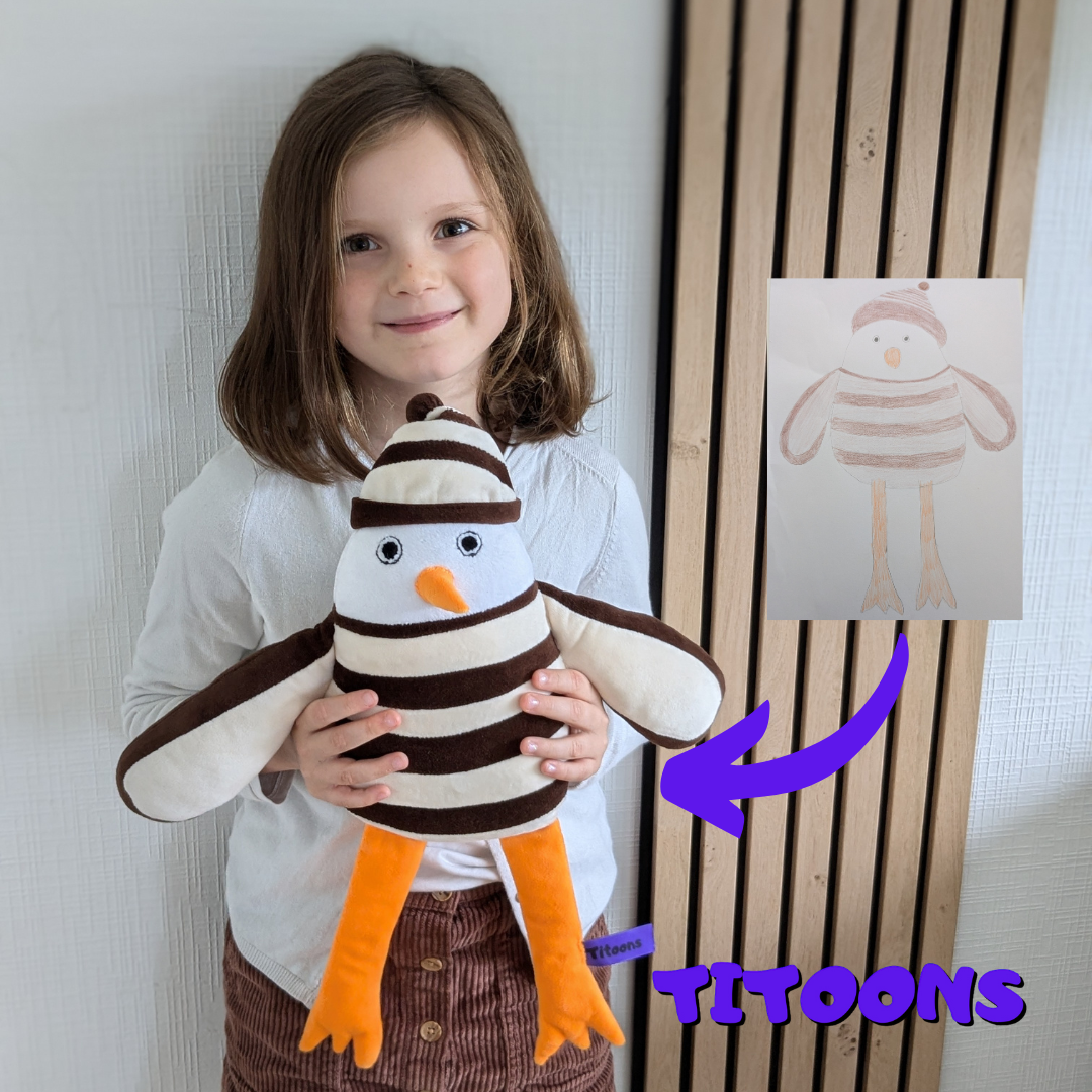 Offrez un cadeau exceptionnel en transformant les œuvres d’art de vos enfants en véritables peluches ! Chaque création est reproduite fidèlement pour donner vie à leur imagination sous forme d’une peluche douce et câline. Chez Titoons, nous réalisons des peluches sur mesure, basées sur les dessins originaux des enfants