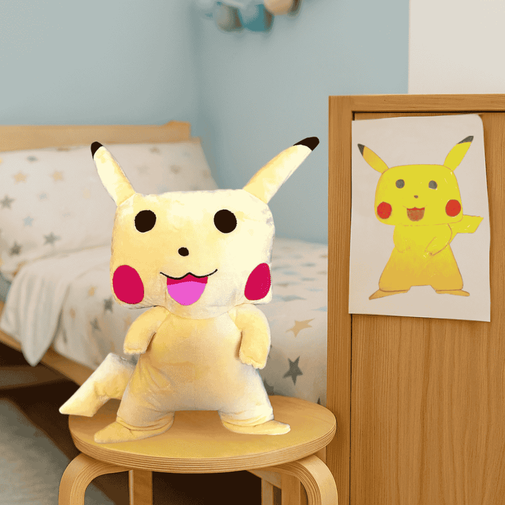 Il vous suffit d’envoyer un dessin ! Nos artisans reproduisent chaque détail pour donner vie à votre propre Pikachu en peluche.